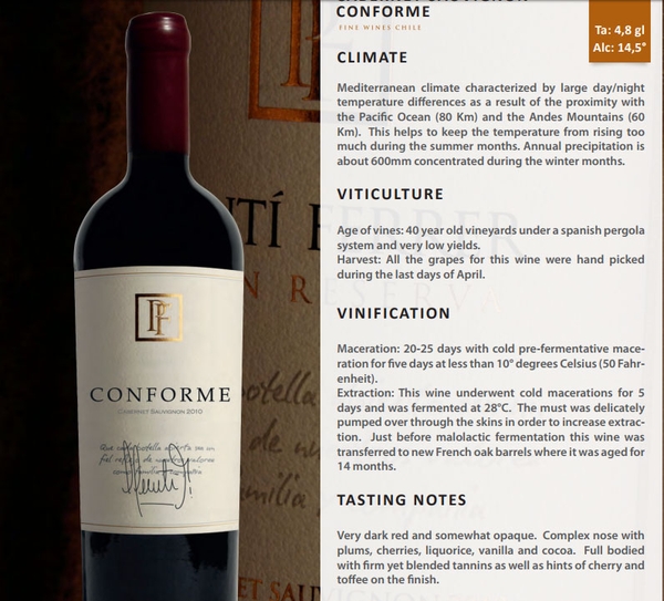 Rượu vang đỏ Punti Ferrer Conforme là chai vang Chile thượng hạng mang nét đặc trưng của thung lũng Curico (Chile) được làm ra bởi nhà sản xuất rượu vang Punti Ferrer. Chai vang được làm hoàn toàn từ giống nho đỏ nổi tiếng thế giới Cabernet Sauvignon.