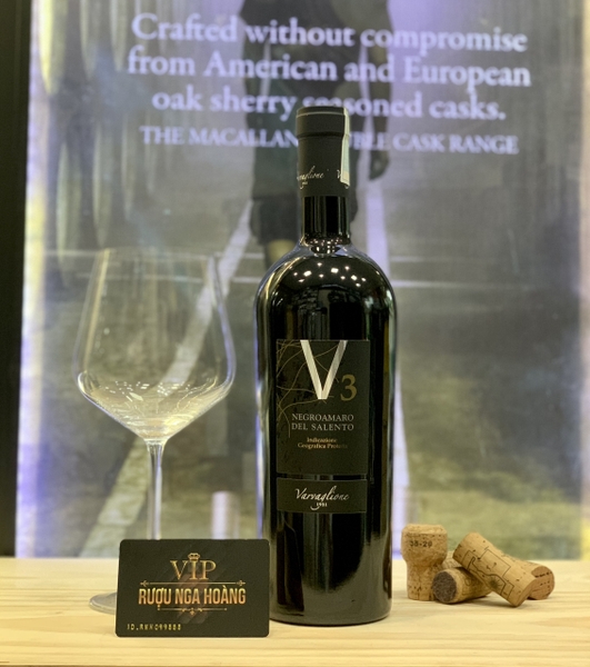 V3 Negroamaro Del Salento được làm từ 100% nho Negroamaro. Nho có hương vị ngon ngọt, giàu đường được trồng ở vùng Salento của Ý và thu hoạch vào sáng sớm trước khi mặt trời mọc. Những trái nho đạt tiêu chuẩn sẽ được đưa về nhà máy để sản xuất. Khi nước ép nho đi vào hệ thống chiết xuất nước ép, nó sẽ tiếp xúc với vỏ nho trong 10 ngày để thực hiện quá trình lên men malolactic.