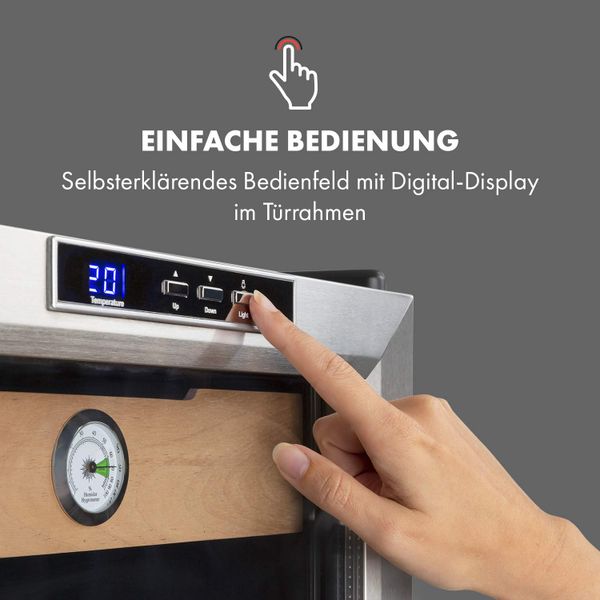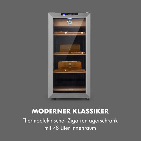 – Tủ cigar Klarstein 78 lít được thiết kế trang nhã với khung chắc chắn bằng thép không gỉ, cửa kính hai lớp với 4 kệ lưu trữ bằng gỗ sồi Tây ban nha. Thiết kế tinh tế và sang trọng tiện bày gia đình, quán bar hoặc câu lạc bộ.