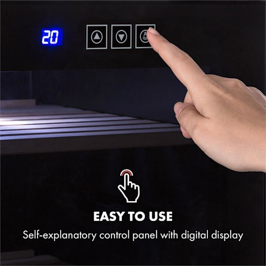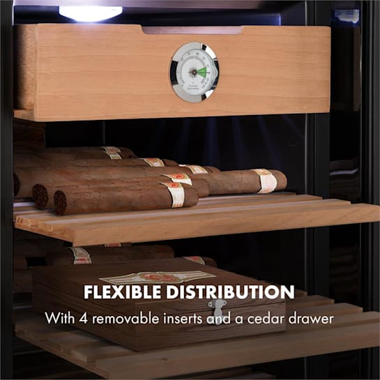 Tủ cigar Klarstein được thiết kế trang nhã với khung chắc chắn bằng thép không rỉ, cửa kính hai lớp với 4 ngăn kệ và 1 ngăn kéo bằng gỗ sồi Tây ban nha.